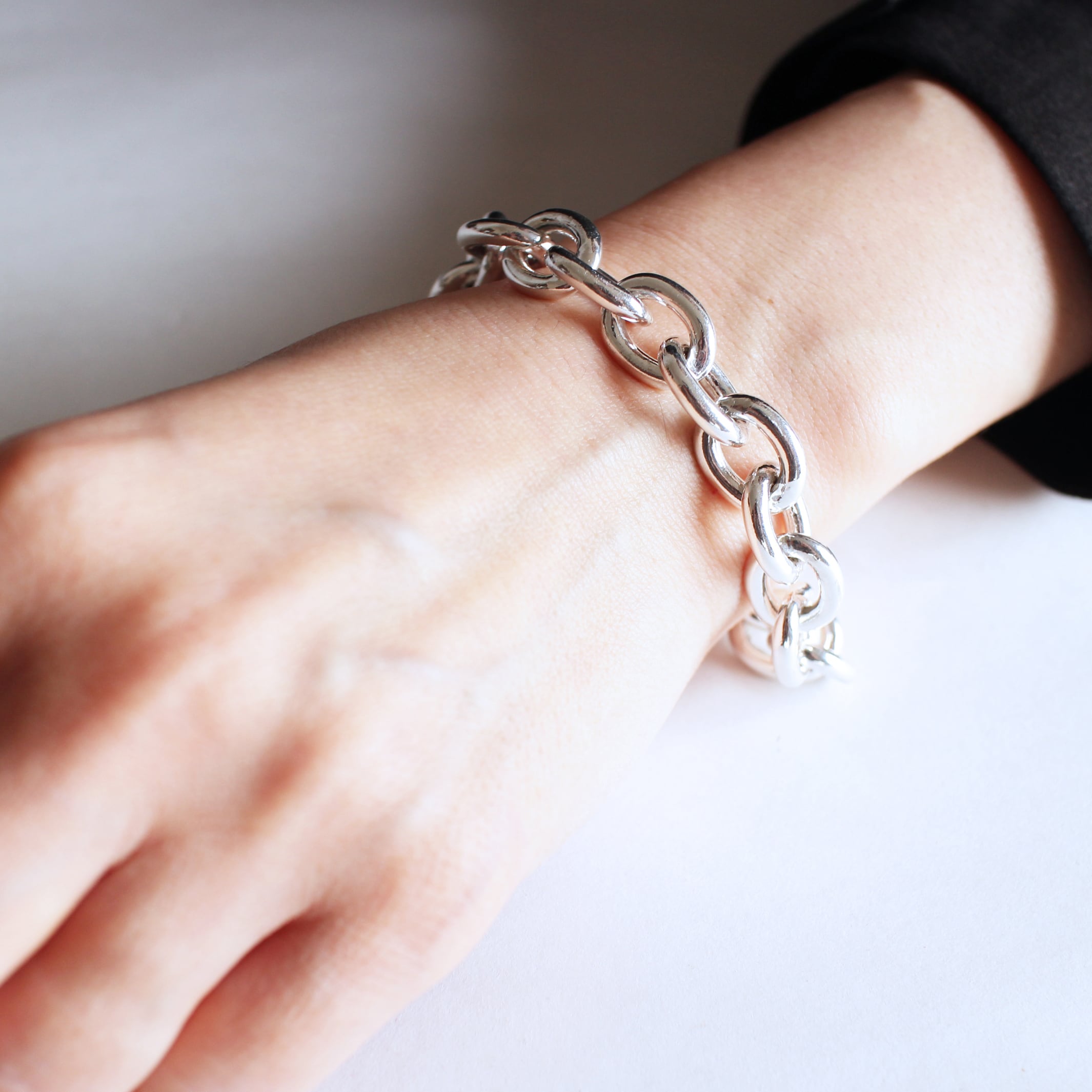 やわらかい印象の楕円状の重厚なチェーンのブレスレット。